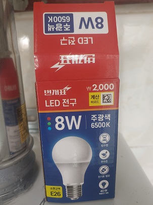 새로 교체한 것은 다이소에서 구매한 8W 주광색 ( 6500K ) 제품입니다.